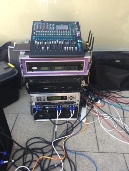Full professional setup with multiple mics, DI boxes, quality PA and monitoring, lighting, host and music infill.